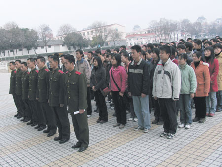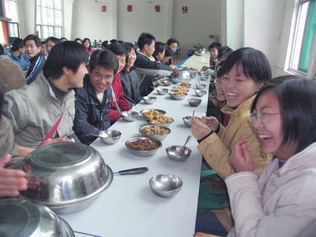 12 : 40 ,同学们被安排在二系食堂就餐,为了能体验了一回军营生活,餐前同学们还合唱了一支军歌,餐后象学员们一样自己洗碗打扫卫生。而后同学们观看了 28 队学员自己制作的学院建设录相以及学员们自己四年成长历程的记录,并与学员们共同探讨了中国周边安全问题。