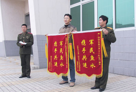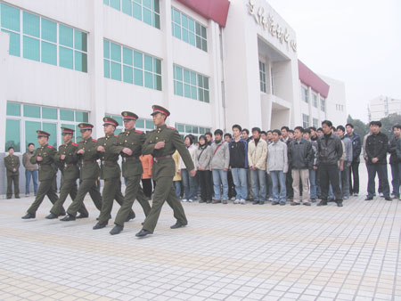 到达目的地后, 28 队举行了盛大的欢迎仪式, 28 队教导员与 03 医本辅导员分别致辞,然后互相交换了“军民鱼水、共建和谐”的锦旗以作留念,随后同学们观看了28队的军乐队表演及队列表演。精彩的表演结束后,同学们跟随 28 队学员分组对炮院进行了参观。不仅参观了学院正规化建设,包括内务建设等,感受到学员宿舍的简洁整齐和令人赞叹的那叠得如豆腐块般有棱有角的被子, 还 游览了美丽的南湖,观摩了威武的炮场,接触了真实的大炮。转出炮场便是训练场,那里有专门为训练军人心理,身体素质而设计的陆军 400 米障碍训练场, 28 队学员们耐心地给 03 医本同学们讲解示范并帮助他们克服心理障碍,让同学们纷纷勇于尝试,还小心保护着每个人的安全,令人十分感动。接下来各组成员又一起观看了东风—11式导弹模型,聆听了学员对其精彩的讲解,并在炮院雄伟的正门合影留念。