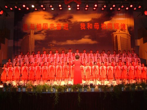 第十七个登场的03医本合唱队,献上的是《走在乡间的小路上》和《远方的客人请你留下来》两支清新自然的歌曲。 40 位美丽大方的女生,40位阳光帅气的男生,加上华美的着装、灿烂的笑容,使得他们看上去还没开口就已具有了几分灵气。当音乐缓缓响起,随着指挥老师的手势,在领唱杨婧的带领下,大家很快投入到歌唱中去,精神饱满、字正腔圆、甘甜柔美是他们特别的精彩,整个演唱过程中他们一直用真情的歌声感染着在场每一个人,他们用真诚的祝福呈给伟大的祖国与辉煌的母校。