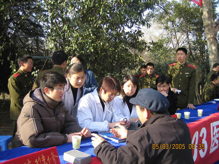 3月5日,春光明媚。第一临床学院03医本青年志愿服务队驱车前往共建单位解放军炮兵学院,为该校师生进行健康咨询活动。志愿者服务队由老师、医生和03医本优秀学生组成。整个上午,大家都忙着为炮院师生测量血压,解答疑问,检查病情。大家把书本知识运用到实践中,把医疗服务送进军营。 这次活动使第一临床学院与解放军炮兵学院二系的军民共建关系更加紧密,军民情谊进一步升温。