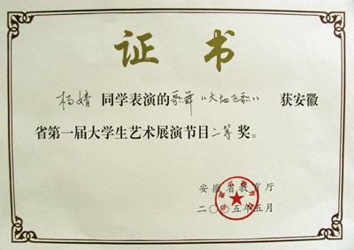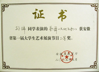 “……哎……大路越宽阔……咳!”在甜美嘹亮的歌声中,2005年5月13日,在安徽大学礼堂举行的安徽省首届大学生艺术展演活动决赛渐渐落下帷幕。 这次大赛分为初赛和决赛两个阶段,汇聚了全省众多高校的许多优秀节目。我校对此次大赛非常重视,共选出三个节目参加初赛。03医本所派送的歌伴舞<<大地飞歌>>脱颖而出,顺利通过初赛,并在决赛中荣获二等奖,为学校增添了荣誉。
