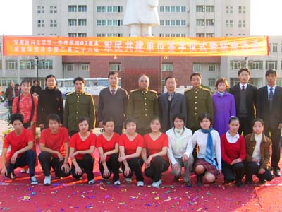 在这阳光灿烂的日子里,我们欢聚在校园文化广场,隆重举行解放军炮兵学院二系28队与安徽医科大学第一临床学院03医本团总支共建签字仪式暨联欢活动。在此,我代表安徽医科大学第一临床学院党总支表示最热烈的祝贺,对炮院二系28队官兵的到来,表示最诚挚的欢迎!