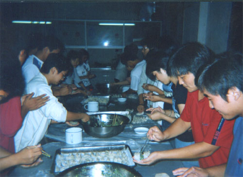 也许这是一个令人难忘的劳动节,我们没有假期,到处充溢着非典的信息。在这一段非常时期,我们组织了“非典讨论小组”,同学们分别表达了对非典的认识,并且搞好卫生以防非典。我们班还开展了许多活动,来缓解同学们的紧张情绪。我们聚会为同学过生日,整个班集体围在一起,共祝他生日快乐,当时的场面真的很令人难忘。我们还在一起打羽毛球,下棋,聊心事。最值得怀念的应该是包饺子比赛了。看那照片上热火朝天的场面,不论是会包的还是刚学的,每位同学都兴趣十足。别说,我们班男生的手艺还真不错。瞧,祝宝丰同学和面的架势。吃饺子时另有一番趣味。实话实说,我们的饺子真的很好吃!