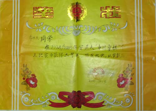 常继民同学在 2004~2005 年安徽医科大学“中国象棋”个人比赛中沉着冷静,不畏强手,一路过关斩将最终获得二等奖 |