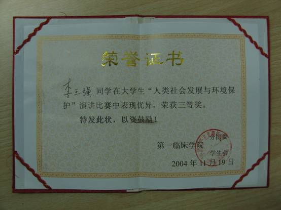 李王强同学在由第一临床学院举办的大学生“人类社会发展与环境保护”演讲比赛中以自己声情并茂的演讲荣获三等奖 |