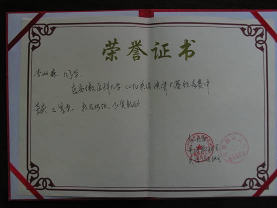 李山山森同学在大一和大二英语演讲比赛中,以及其标准和流利的发音获校二等奖、三等奖各一次。随后她在学校参加了 2004 年 CCTV 杯全国英语演讲比赛预选赛,获得三等奖的好成绩。另外她还积极参加各种文艺活动, 2004 年代表我们年级参加学校的健美操比赛取得了优异的成绩,这与她从小就练习舞蹈是分不开的,正是这种才能使她成为校健美操队的骨干,备战各种比赛。站在舞台上的两年所经历的风雨与坎坷已经让她成熟许多,领会很多!为此她耽搁了很多的学习时间,但她是一位优秀的女孩,从不向困难屈服,所以她的专业课成绩也很优秀,而且动手能力很强,以后一定会成为一位优秀的医生!