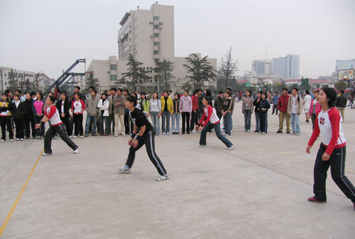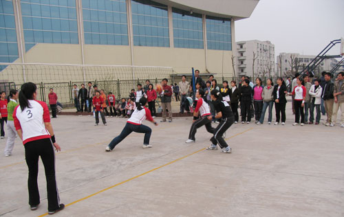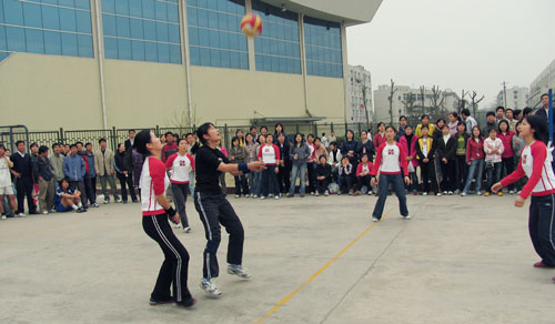 时过一年, 06 年的校排球联赛从 3 月末开始,我们从接到通知起便开始了紧锣密鼓地训练,几乎每天下午加上周末的两个上午,我们的队员都准时到达排球场地。周六、周日上午 7 点多钟,同学们还在睡梦中,我们早早起来甚至来不及吃早饭便奔往排球场,就这样空着肚子一直练到 11 : 30 。训练中,队员们的手因发球肿胀的无法握笔,因接发球双前臂腕部布满了淤点,因传球伤及大拇指致鱼际肌周围淤血青紫 ------ 每每队员们都晒的面红耳赤,热的大汗淋漓,累的全身疲惫,但大家仍彼此笑着给队友鼓劲加油。为了打牢基础,记得自由人坚持练习对墙垫球,主攻队员狠练网上扣、调球及拦球技术,这其中由于我们自我保护意识不够,以致主力队员沈国秀、洪楠在拦球、接球过程中扭伤脚踝,摔伤腿骨,这也是今年影响我们实力的一个因素。即便如此,她们还坚持看我们练球,我们深受感动与激励,下定决心坚持到底。